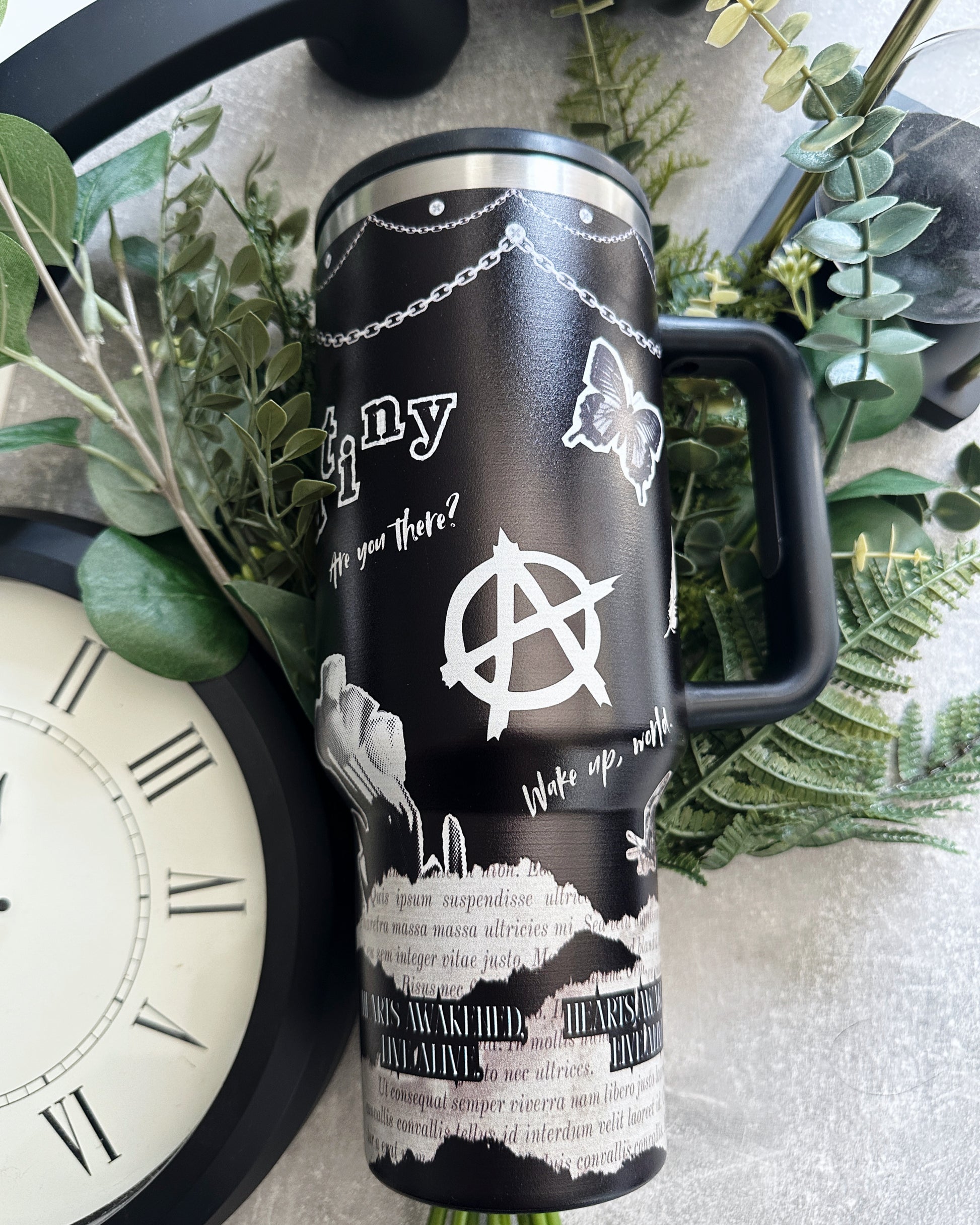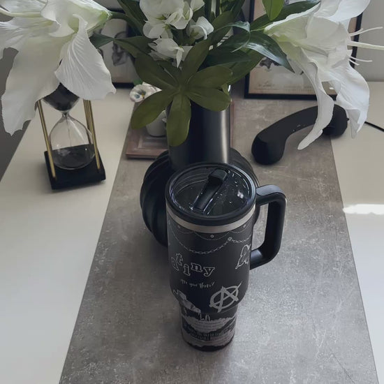 This 40 oz (1,2L) Tumbler keeps your drinks warm or cold for hours and hours and with its leakproof lid and straw its perfect to be taken with you on your concert roadtrips, to work, school or university. Also this will keep you warm or refreshed in your next numbering queue.Â